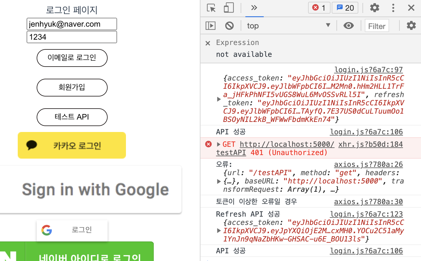 Back 코드를 보시면 토큰 검증 오류일 경우에는 401로 주게 해놨습니다. 이러한 이유는 곧 보여드립니다.