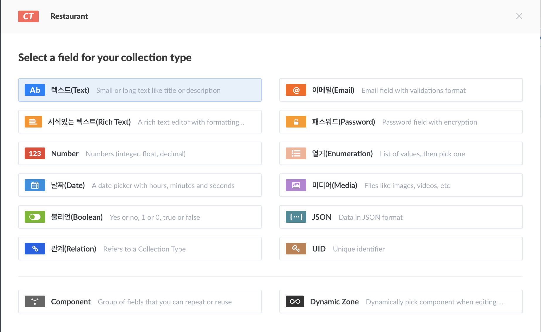 restaurant를 하나 만들어주고, Text collection도 하나 만들어 줍니다.