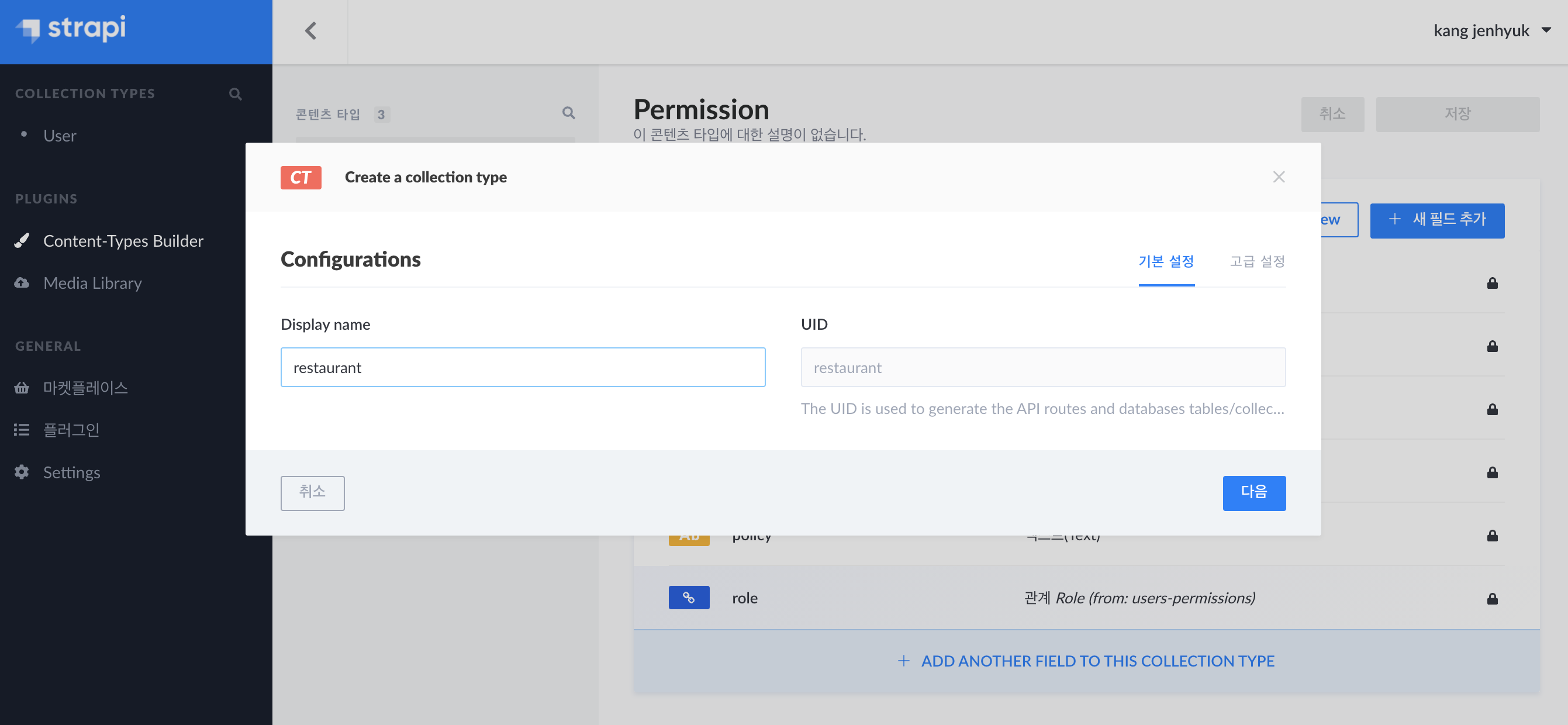 왼쪽에 Content-Types Builder에 들어갑니다.