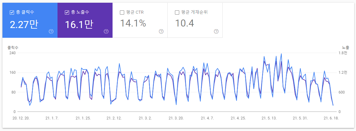 저번 분기에 비해 클릭수, 노출수, CTR, 평균 게재순위까지 전반적으로 올랐다.