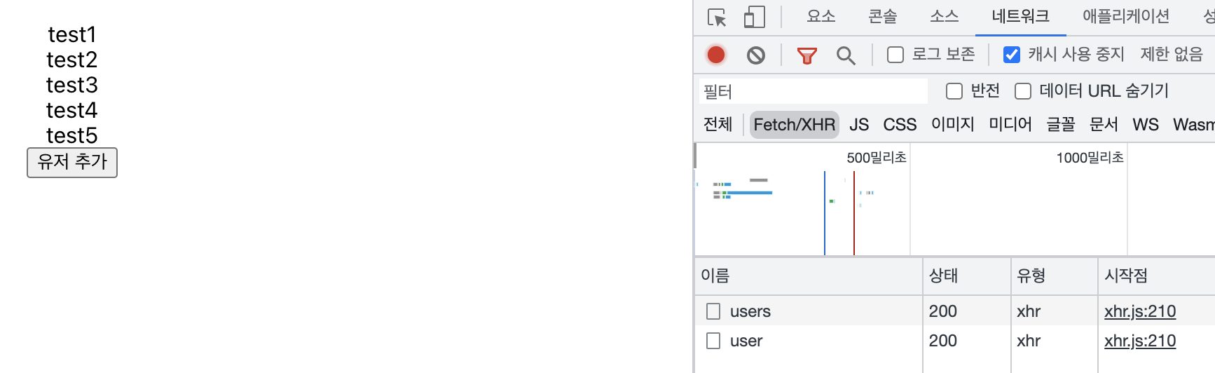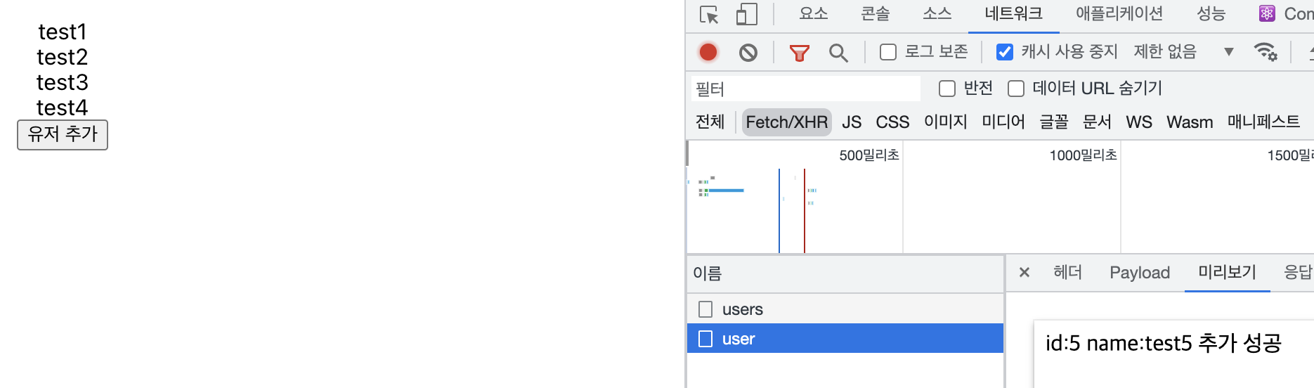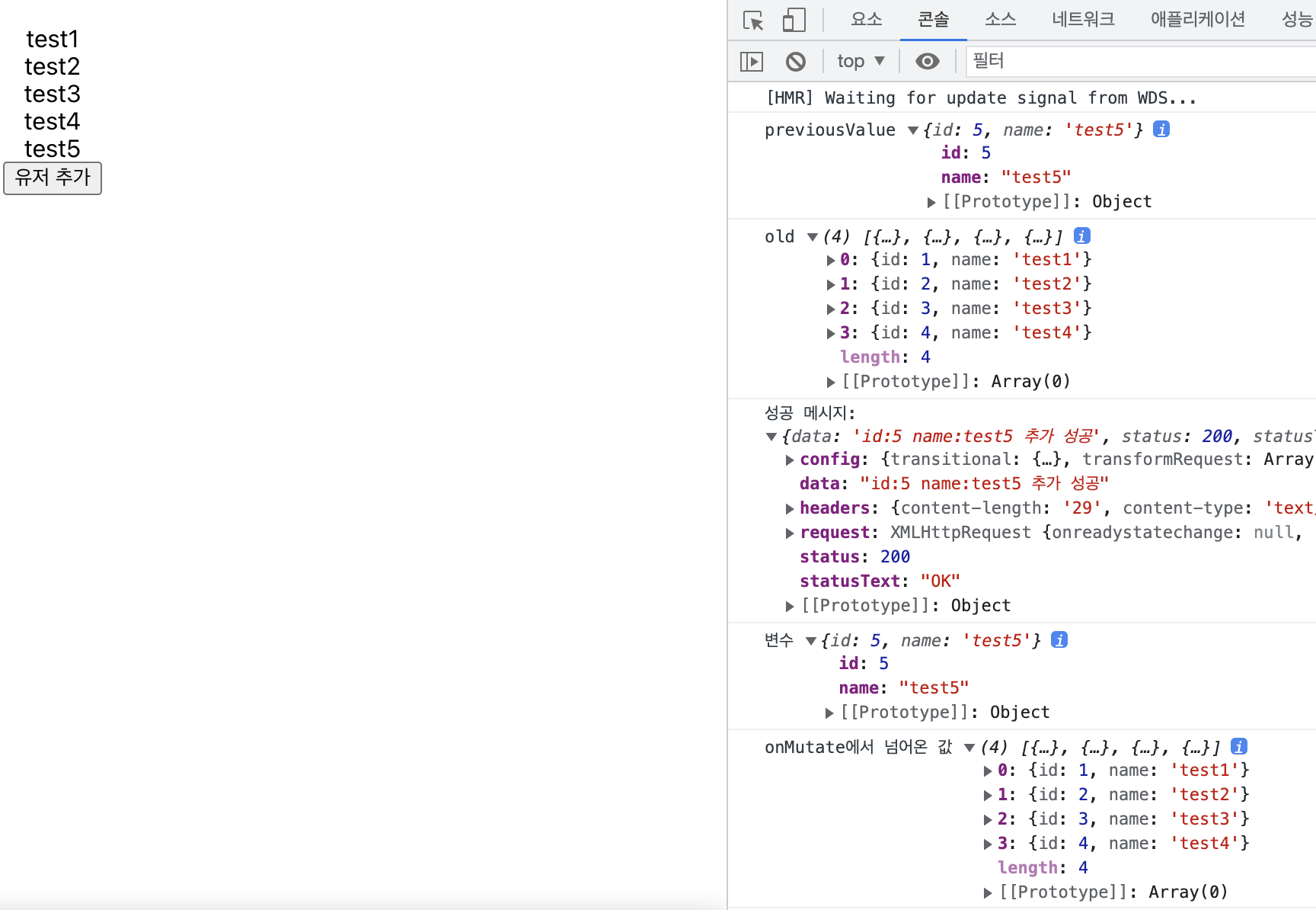 프론트에서는 데이터가 fresh하지 않기 때문에 test5가 추가된 것을 모릅니다.