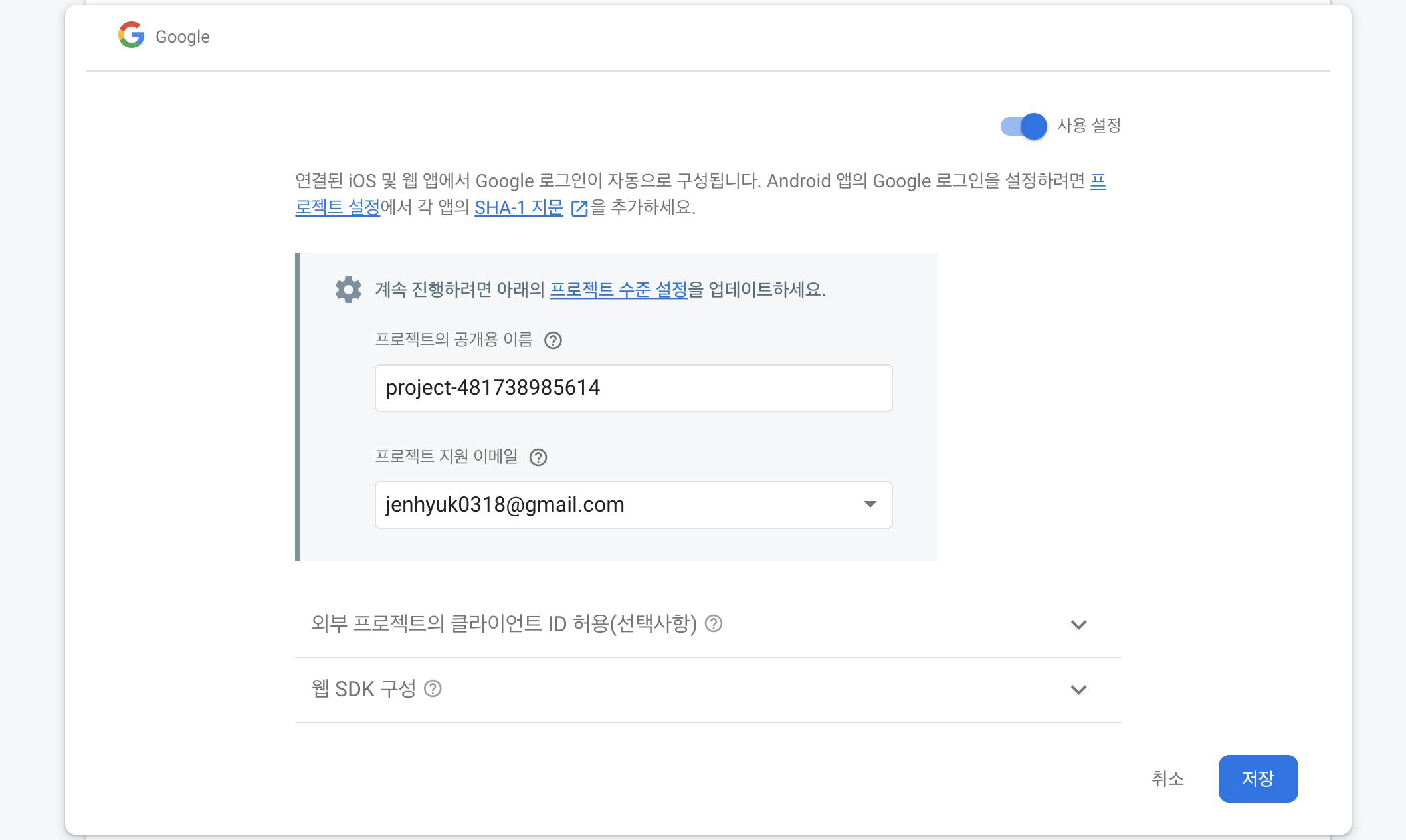 설정은 firebase console 들어가서 프로젝트 설정에 있습니다.