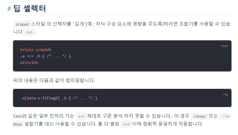 그리고 자식 최상위 DOM에만 접근 가능하며 더 안쪽으로 들어가고 싶다면 ::v-deep(또는 '>>>', '/deep/') 을 사용해서 접근해야 합니다.