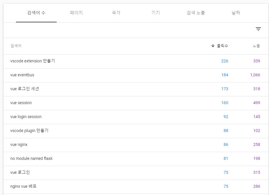 그 외에는 vue 관련 검색어가 대부분이다.
