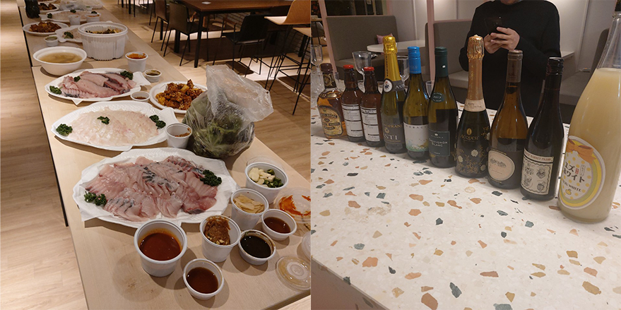 사내 술 좋아하는 사람들끼리 작게 만든 슬랙 방에서 소소하게 영화 한 편 보며 칵테일 마시는 걸 기획했는데, 인원이 약 20명 가까이 모여서 대규모 칵테일파티가 열였다. 이때의 분위기가 너무 좋아서 2차도 기획하셨는데 그때에는 대방어를 사 와서 회사에서 먹었다. 물론 술과 함께...!