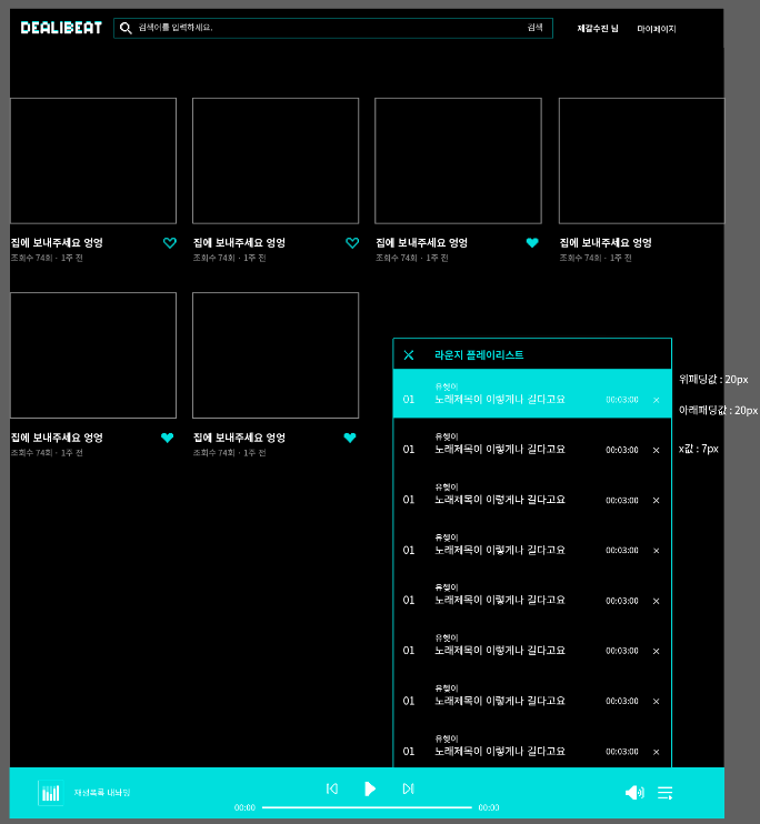 저는 기능 위주로 개발하고, 꼬꼬마님은 멜론, 사운드 클라우드 등 음악 스트리밍 서비스의 디자인 사전 조사를 했습니다.