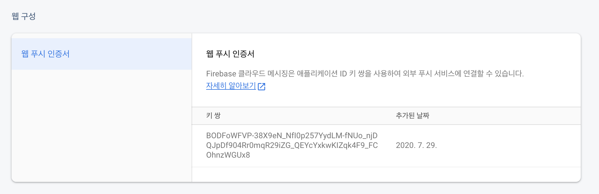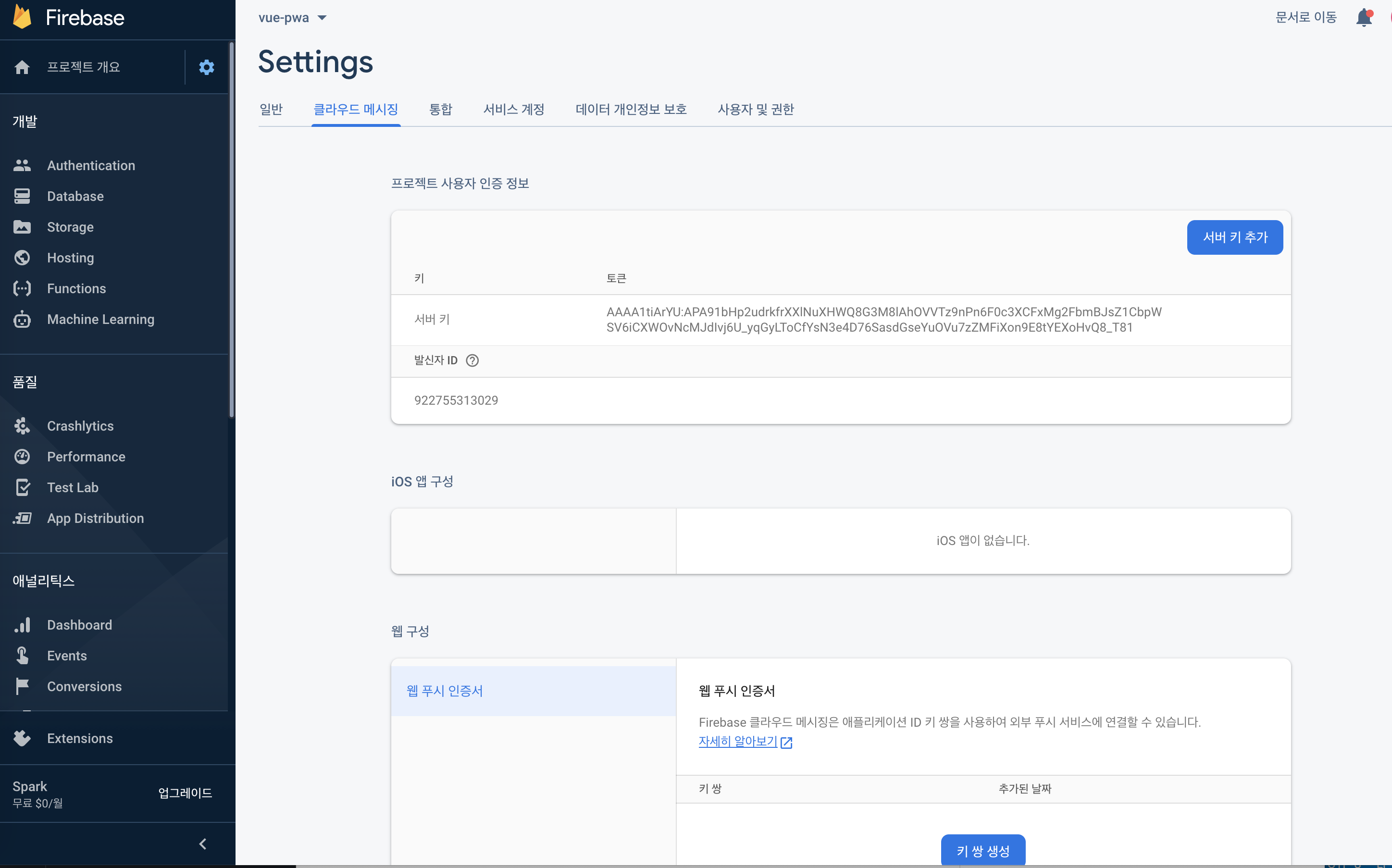 여기서 중요한 것은 서버 키를 잘 기억해야 하는데, 나중에 푸시 보낼 때 헤더에 넣어야 하기 때문입니다.