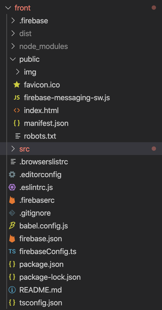 하지만 firebase-messaging-sw.js 파일은 직접 만들어서 public 폴더 아래에 넣어주시면 됩니다.
