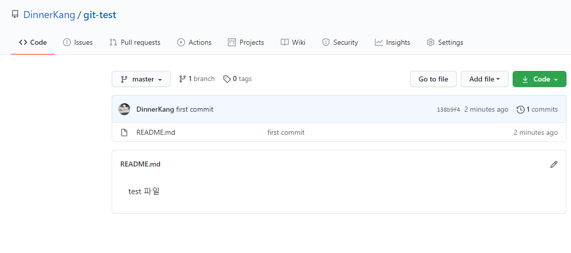 원격 저장소에 내가 만든 파일이 생성된 것을 볼 수 있습니다.