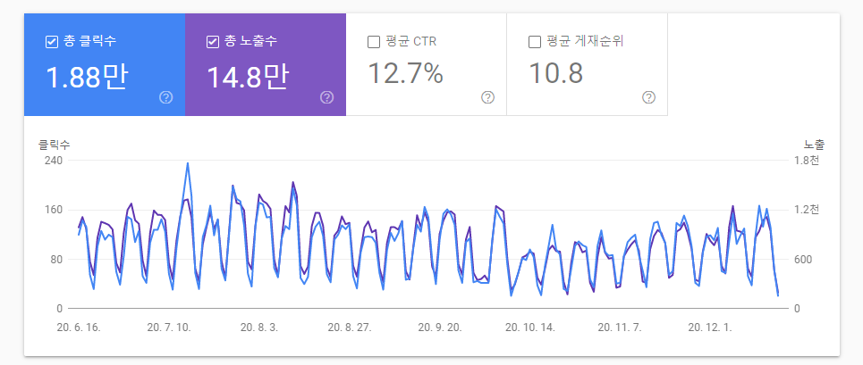 상반기와 비교하면 총 클릭수는 약 8천, 총 노출수는 약 7만 상승했다. 하지만 평균 CTR과 평균 게재 순위가 0.8%, 0.2 정도로 조금 낮아졌다.