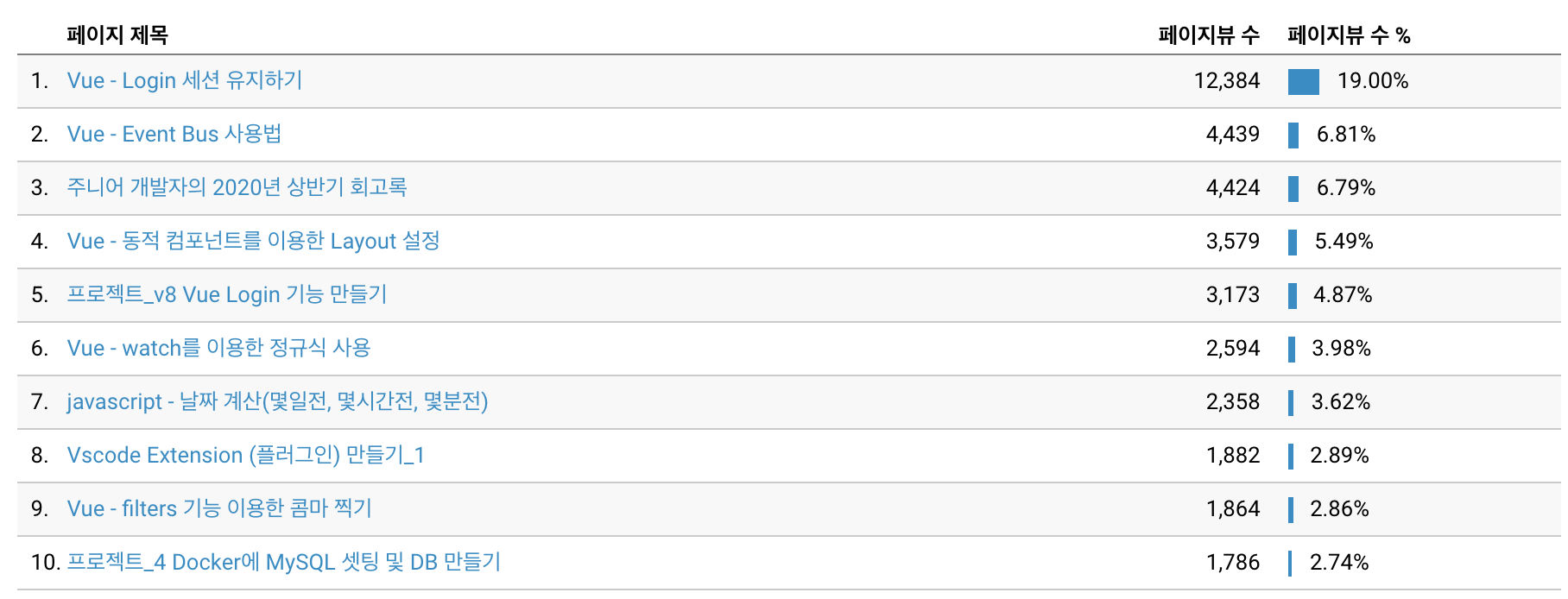Vue Login 관련 포스팅이 압도적으로 많은 비율을 차지하고 있으며, 상반기 회고록이 치고 올라와서 기분이 좋다.