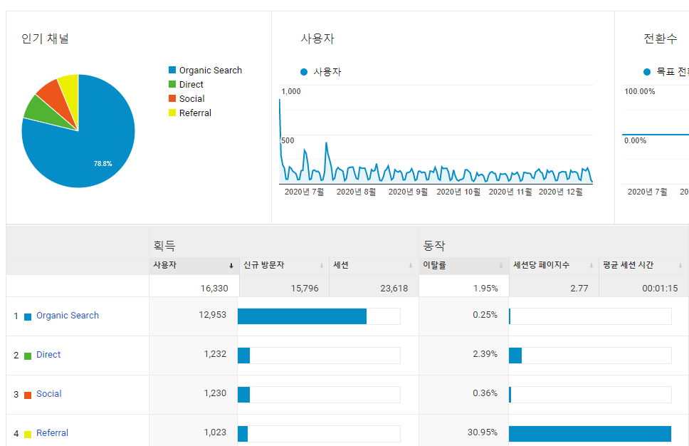 역시 대부분 검색으로 유입되고 있으며, 소셜은 대부분 페이스북, Referral은 깃허브와 이번에는 특이하게 Daum에서 많이 유입되었다.