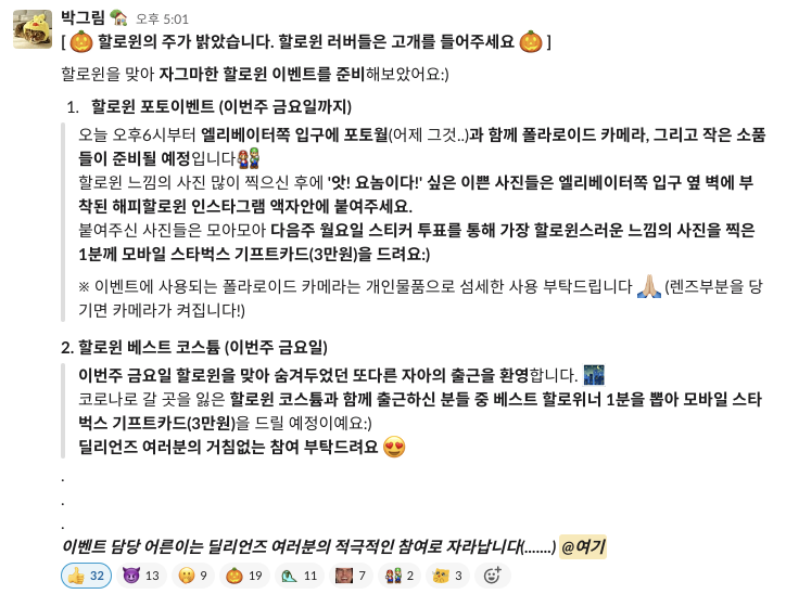 하반기를 돌이켜보면 생각보다 많은 일을 했고, 새로운 분들과 협업을 했고, 다양한 분들과 술을 마시며 이야기를 나눴다. 그리고 회고록에 전부 적지 않았지만 사내 이벤트가 종종 있었다.