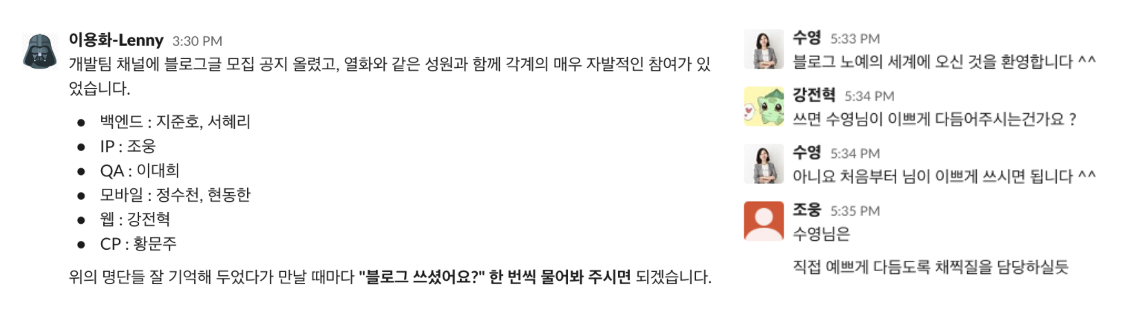 회사에서(용화님이) 기술 블로그 운영 준비를 한다고 하며, 글 쓸 사람들을 모집했다. 사내 블로그 모임에서도 몇 명 참여하게 되었으며, 나도 참여했다. 평소에 장난스럽게 끄적끄적 쓰던 글이 아닌 회사 기술 블로그라 진지하게 써야 한다는 점에서 부담을 느꼈다. 그래도 글을 정리하면서 업무에 필요한 기술을 제대로 한 번 더 공부할 기회가 되고, 회사 블로그에 내가 쓴 글이 올라간다는 점이 뿌듯해서 더욱 열심히 썼다.