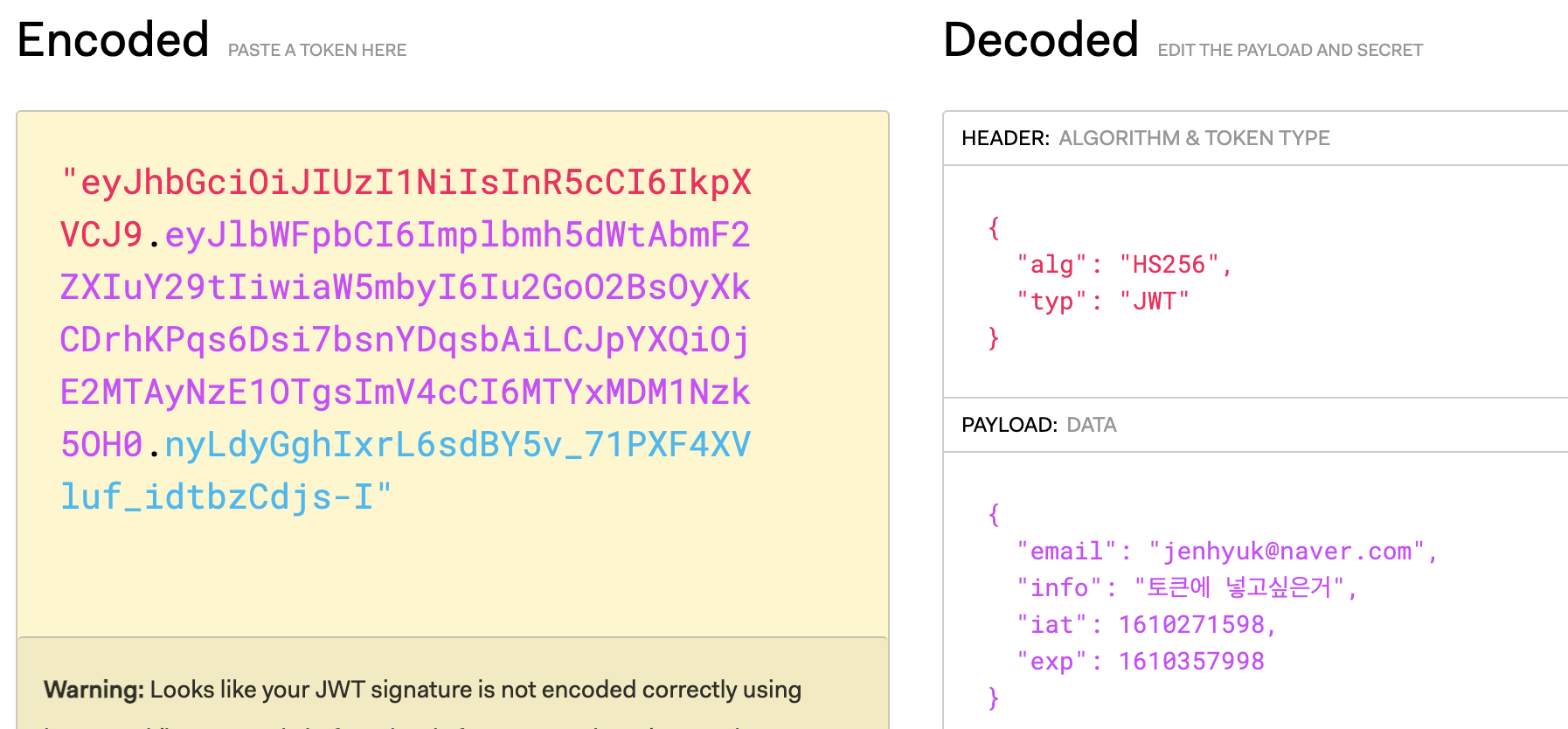토큰을 확인해보면 토큰 정보가 잘 들어가 있는 것을 확인할 수 있습니다.